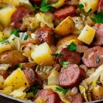 This quick and hearty skillet meal brings together crispy potatoes, juicy kielbasa, and tender cabbage—all ready in just 20 minutes.