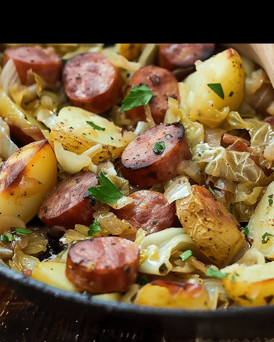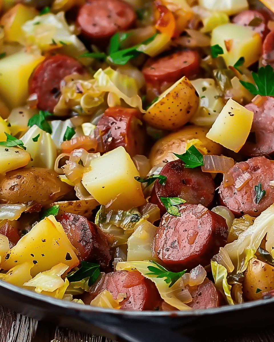 This quick and hearty skillet meal brings together crispy potatoes, juicy kielbasa, and tender cabbage—all ready in just 20 minutes.