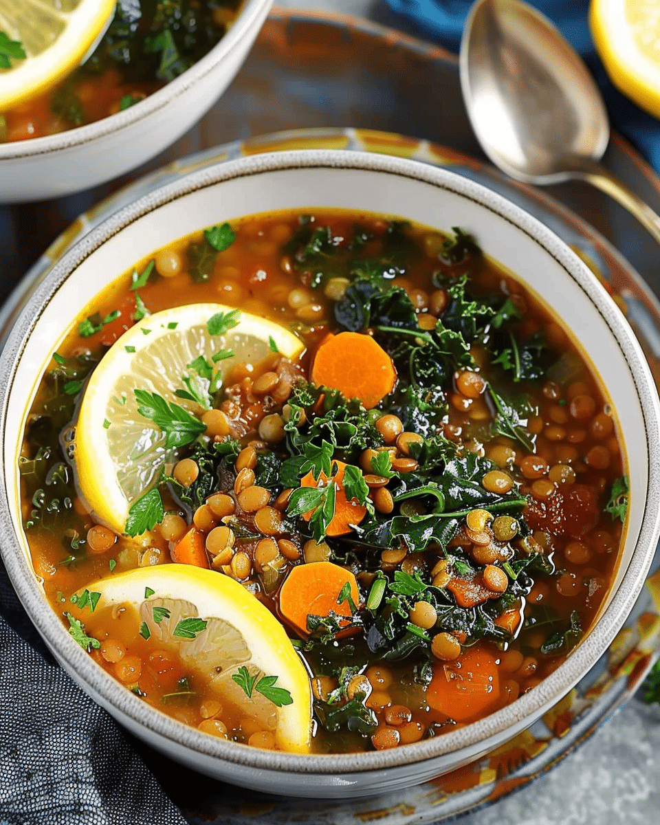 A vibrant, hearty Mediterranean lentil soup made with kale, tomatoes, and warming spices—finished with lemon and olive oil for a comforting, healthy bowl.
