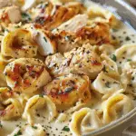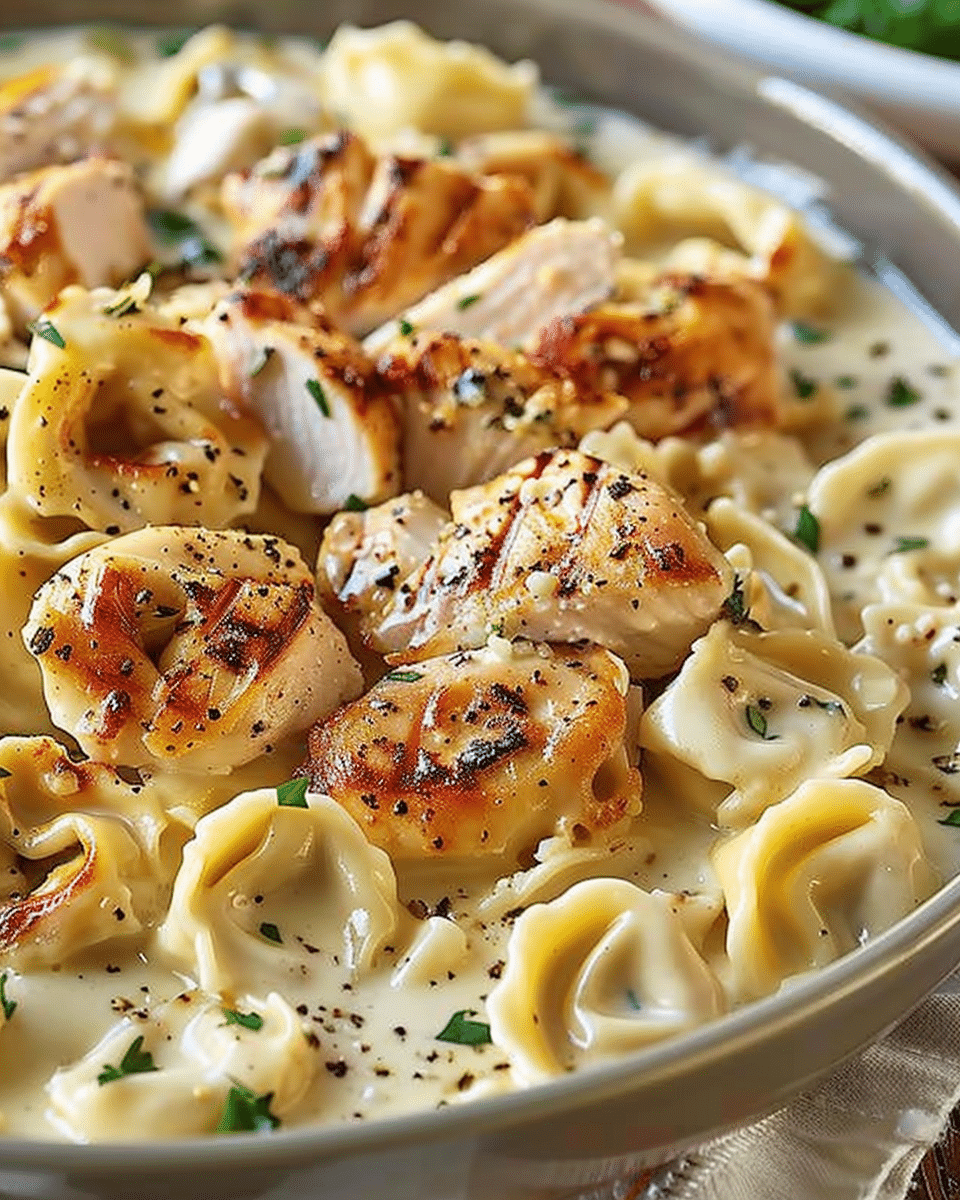I love this dish because it brings together so many comforting elements—pillowy cheese-filled tortellini, smoky grilled chicken, a luscious homemade Alfredo sauce, and that final golden, cheesy breadcrumb topping. It’s the perfect fusion of creamy and crunchy, with enough richness to make every bite feel indulgent. This meal is great for impressing guests or enjoying as a weeknight comfort dinner.