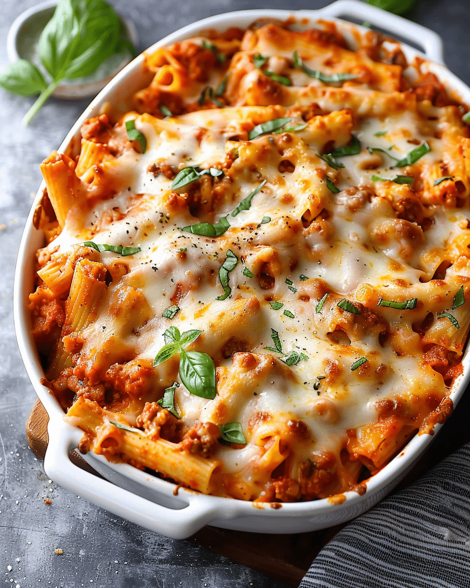 Classic baked ziti made with Italian sausage, creamy ricotta, and plenty of melted cheese. This comforting pasta bake is perfect for family dinners, potlucks, or feeding a crowd.
