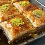 Baking and Finishing 12. I bake the baklava at 325°F for 1 hour and 15 minutes until it’s golden brown and crisp. 13. Right after it comes out of the oven, I spoon the cooled syrup evenly over the hot baklava. I can hear it sizzle as it soaks in, which tells me it’s going to stay crispy. 14. I let it cool uncovered at room temperature for at least 4 hours (or overnight) so the syrup fully penetrates. 15. Before serving, I sometimes garnish with a drizzle of melted chocolate and a sprinkle of chopped walnuts.