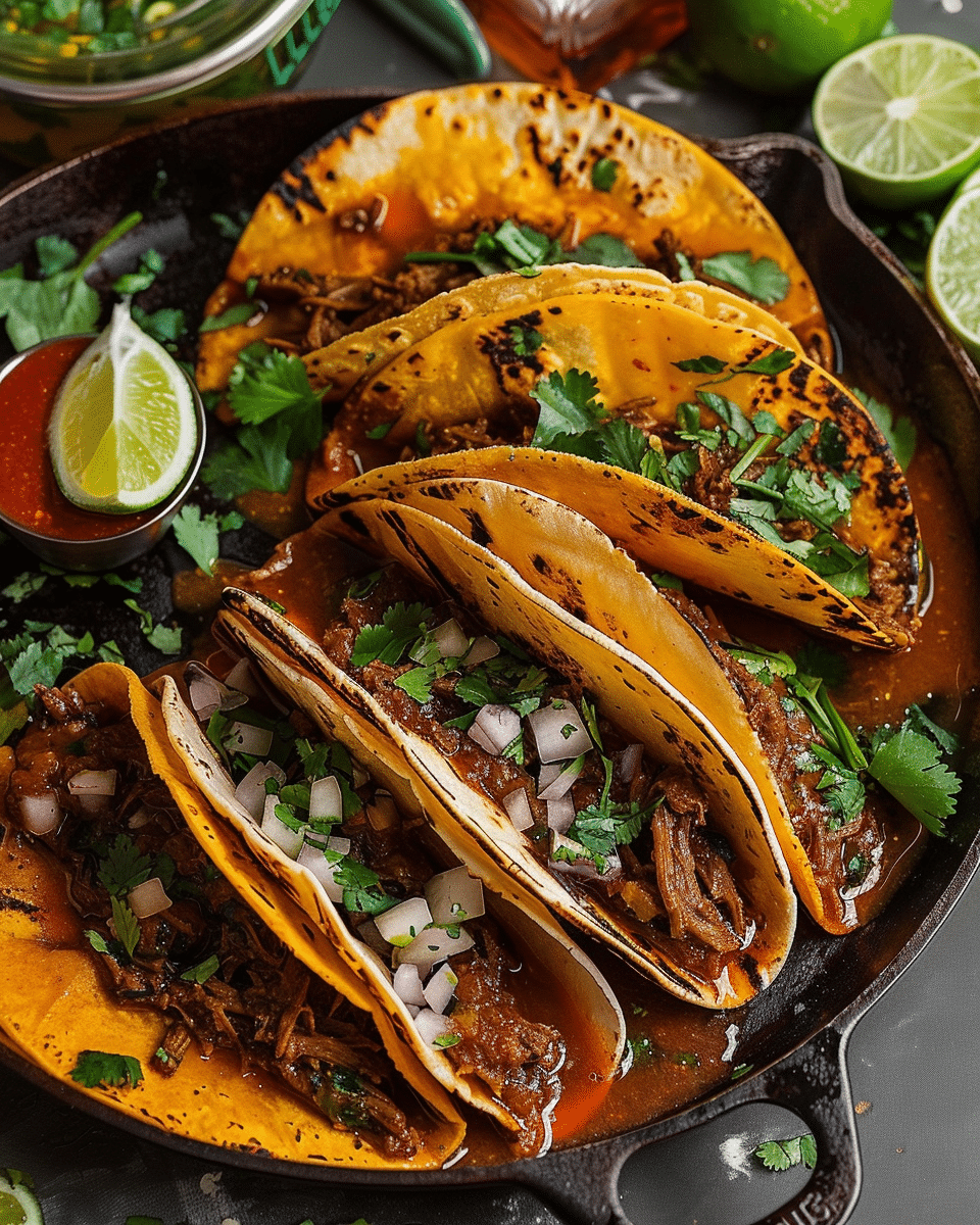 For the birria: 3 lbs beef chuck roast, cut into large chunks 1 lb beef short ribs (optional, but adds richness) 1 onion, quartered 6 cloves garlic 2–3 dried guajillo chiles, stemmed and seeded 2–3 dried ancho chiles, stemmed and seeded 2 chipotle chiles in adobo 1 tablespoon Mexican oregano 1 teaspoon ground cumin 1 teaspoon smoked paprika 2 bay leaves Salt and pepper to taste 4 cups beef broth 2 tablespoons apple cider vinegar 1 tablespoon oil (for searing)