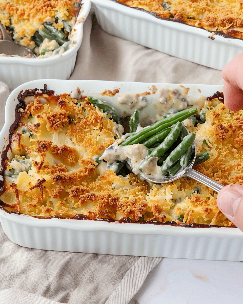 I store leftovers in the refrigerator, covered, for up to 5 days. It reheats well in the oven at 350°F for 15–20 minutes until hot, or in the microwave for individual portions. For longer storage, I freeze the casserole (without the crispy onions) for up to 6 months. When I’m ready to serve, I thaw it overnight in the fridge and reheat, adding fresh onions at the end to crisp up.