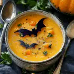 A cozy and creamy butternut squash soup that’s perfect for Halloween! Topped with black pasta bats and cream cheese eyes, it’s a fun and spooky twist on a fall classic.