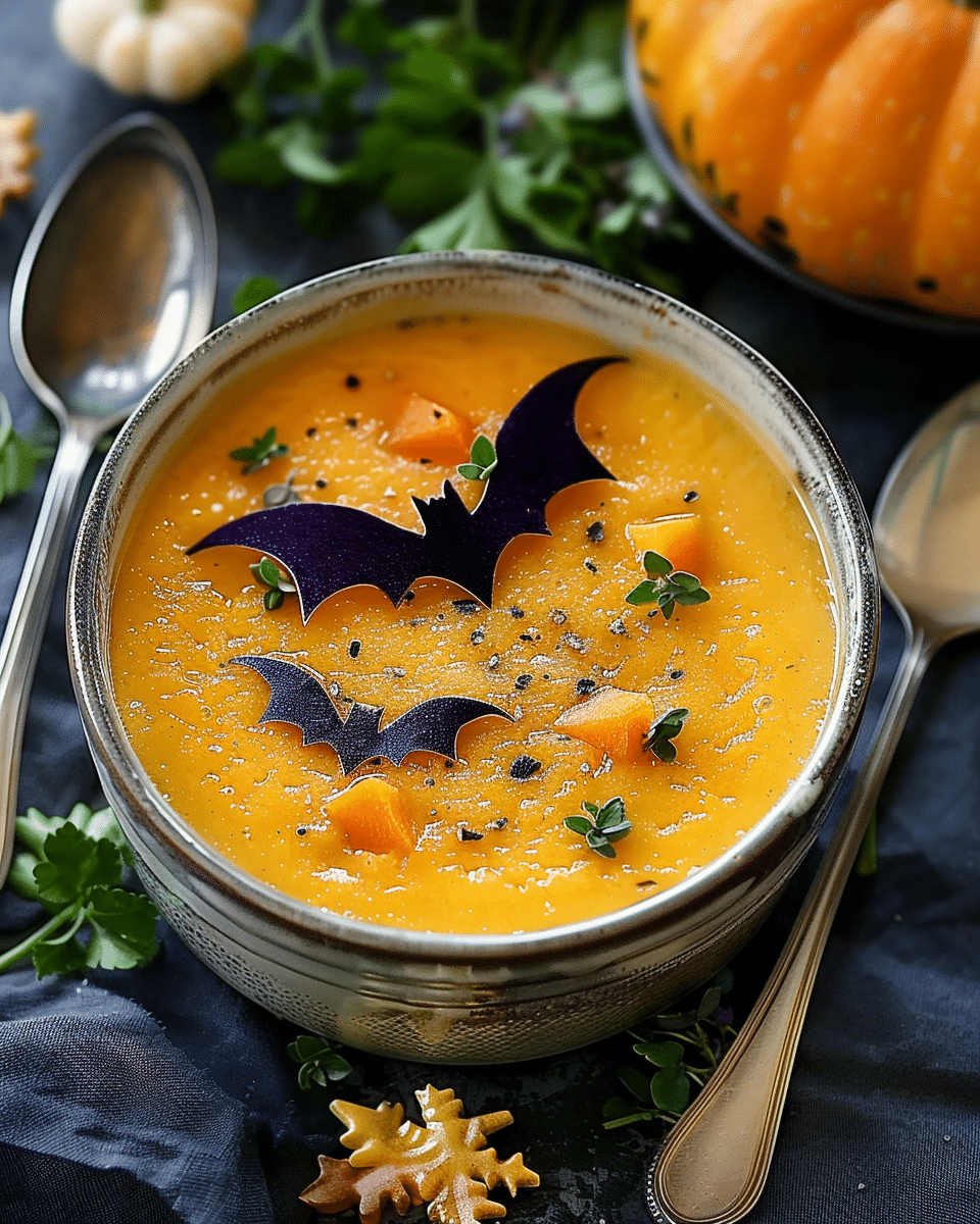 A cozy and creamy butternut squash soup that’s perfect for Halloween! Topped with black pasta bats and cream cheese eyes, it’s a fun and spooky twist on a fall classic.