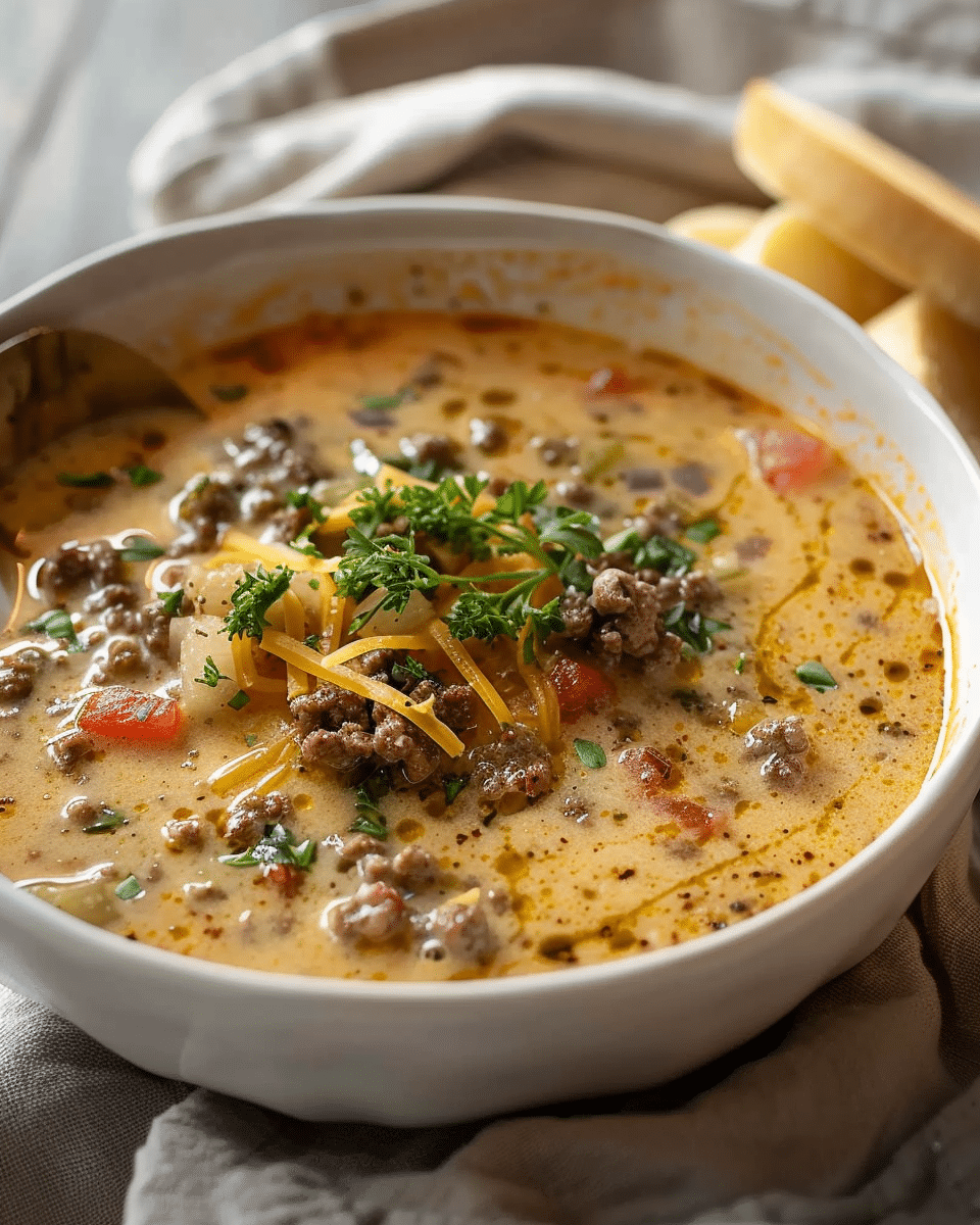 I love this soup because it brings all the best parts of a cheeseburger into one creamy, crave-worthy pot. The beef gives it a meaty depth, while the potatoes make it filling without being heavy. Freshly grated cheddar melts right in, adding cheesy goodness to every bite. I like that it’s easy to make and even easier to customize—plus, leftovers reheat beautifully, making it perfect for meal prep.