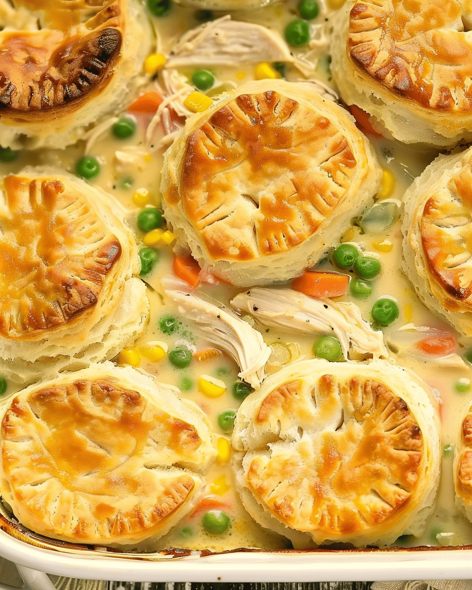 This creamy chicken pot pie casserole is pure comfort food—tender chicken, hearty veggies, and buttery golden biscuits baked to perfection for an easy family dinner.