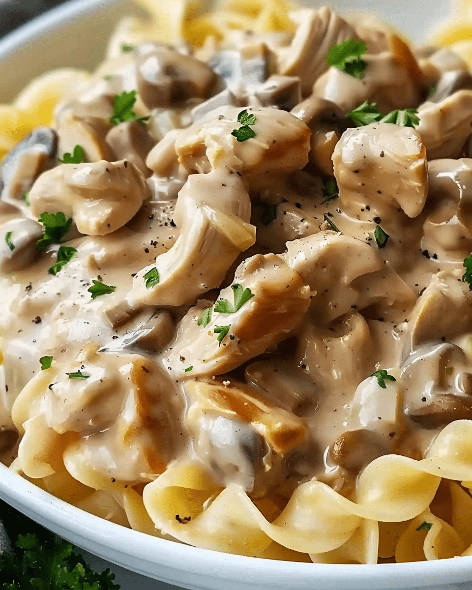 This creamy chicken stroganoff is the perfect slow cooker comfort food. Tender chicken, hearty egg noodles, and a rich mushroom sauce make it a cozy, family-favorite dinner.