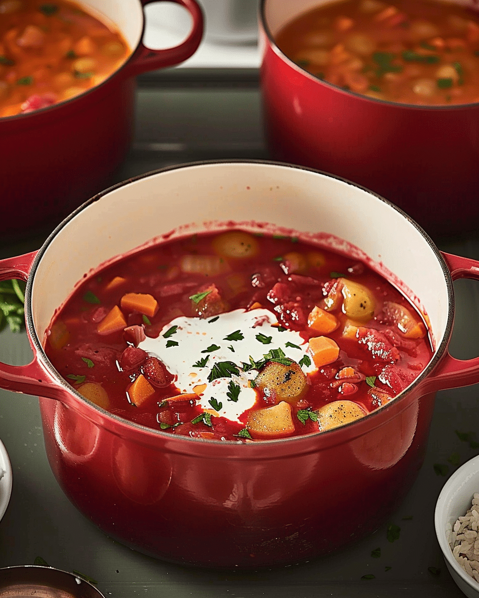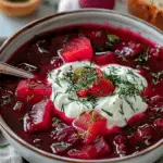 I love how nourishing and hearty this soup is without feeling heavy. Borscht is full of vegetables like beets, potatoes, carrots, and celery, making it both filling and nutritious. The broth is infused with garlic, dill, and a slight tang from vinegar, creating a beautiful balance of sweet, savory, and sour. It’s also a great make-ahead recipe—flavors deepen over time, so it’s even better the next day. Whether I’m cooking for my family or meal-prepping for the week, this soup always delivers.