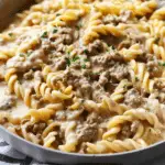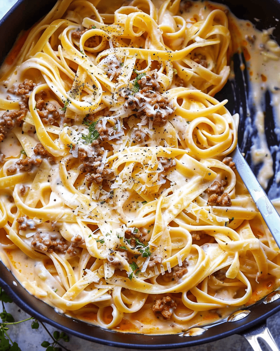 Tender pasta coated in a rich Parmesan Alfredo sauce with savory ground beef—easy, comforting, and ready in just 35 minutes!
