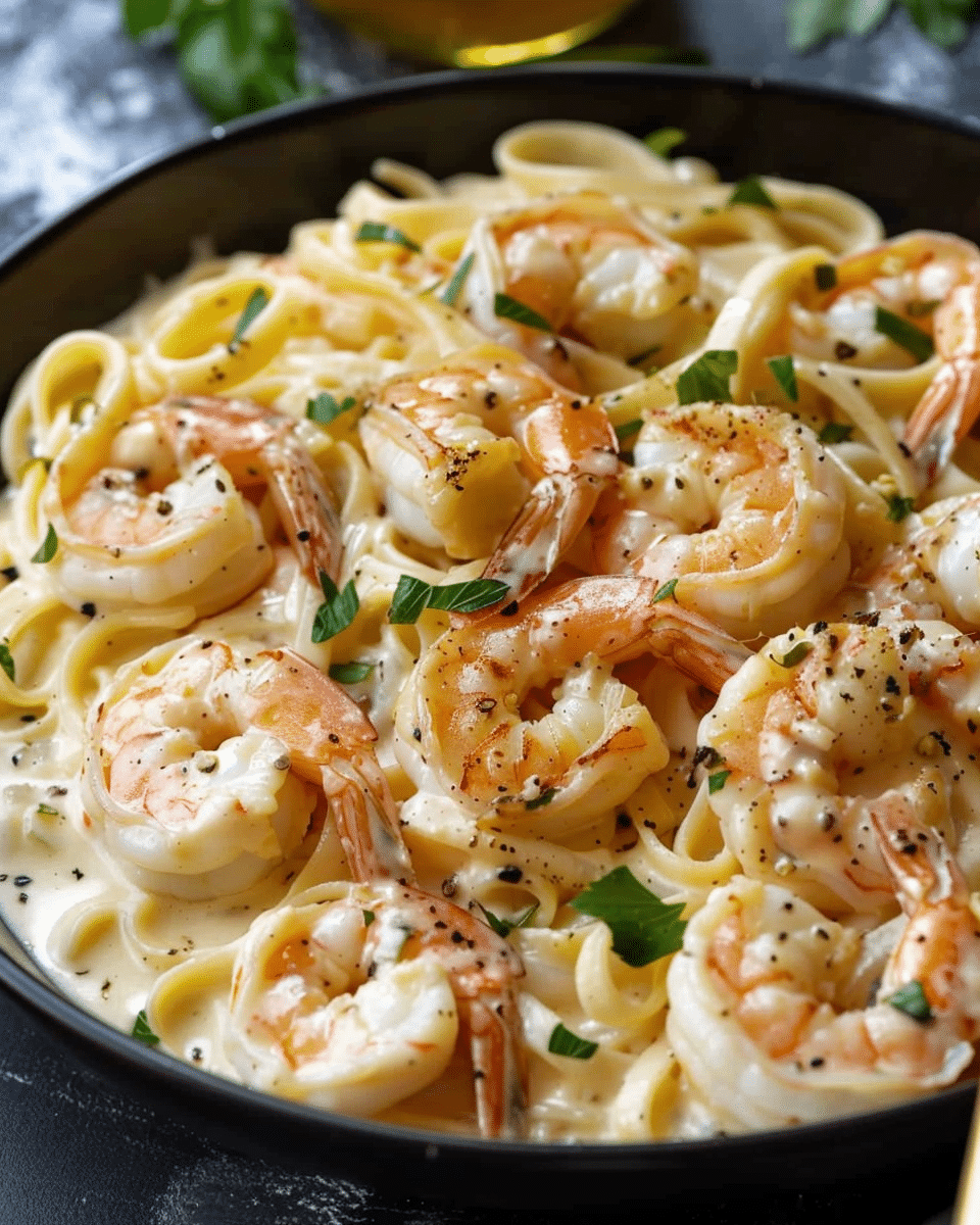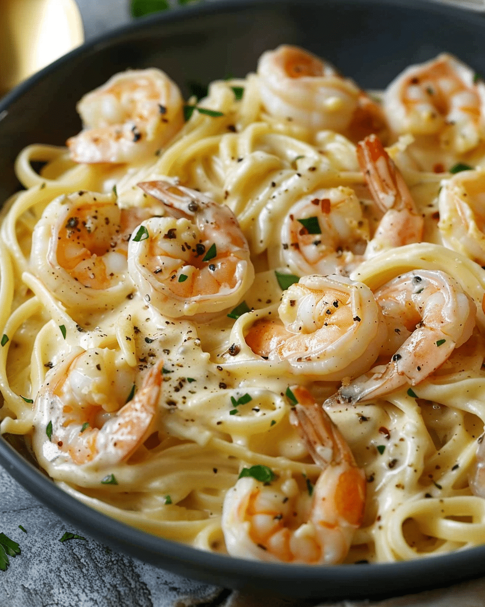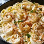A rich, indulgent fettuccine pasta dish tossed with juicy shrimp and a velvety Parmesan cream sauce—classic comfort food made easy in one skillet.