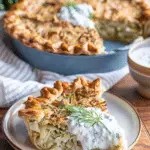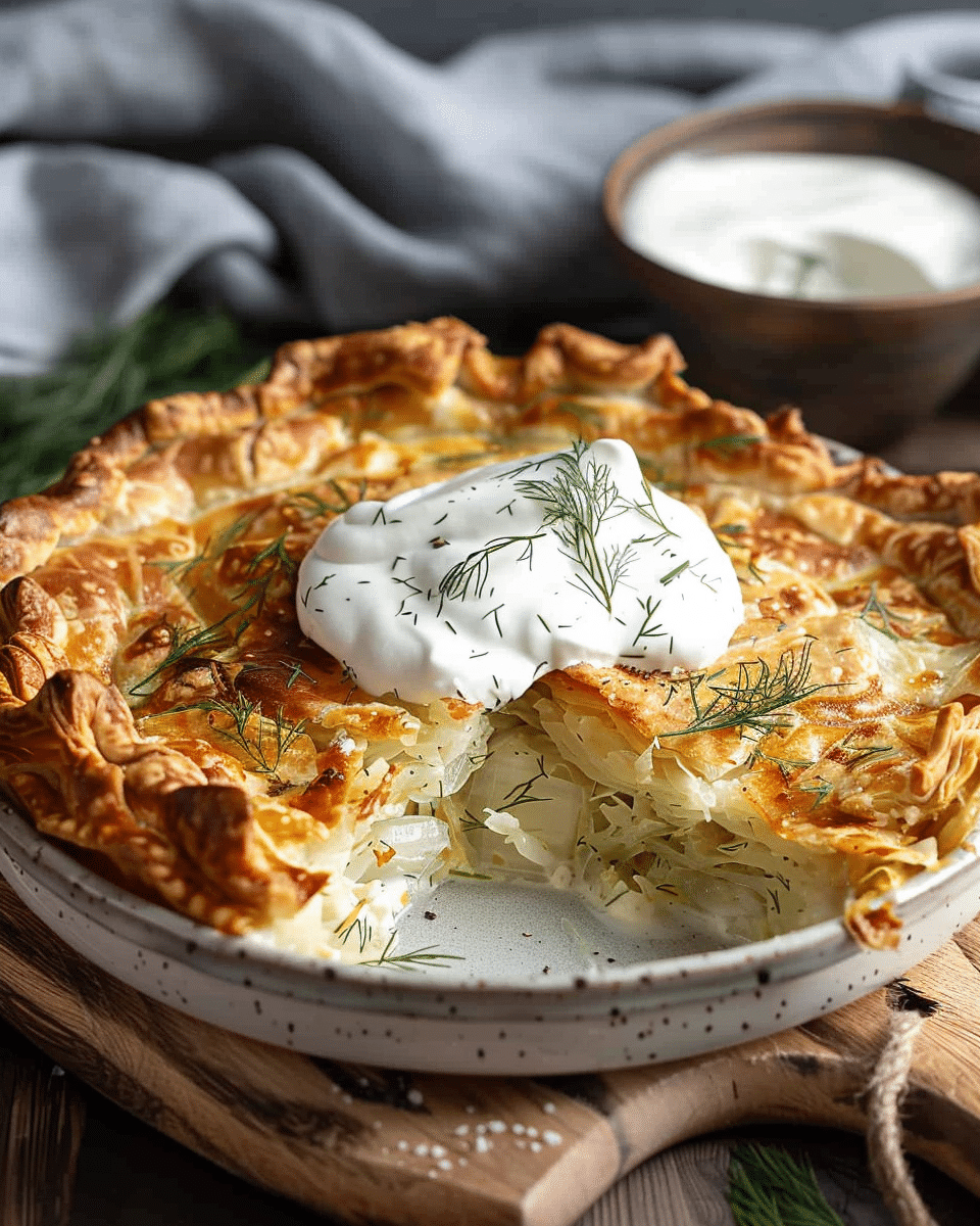 This crispy cabbage pie with dill cream sauce is the ultimate vegetarian comfort food! Golden pastry, tender cabbage, and a tangy dill sauce make every bite satisfying.