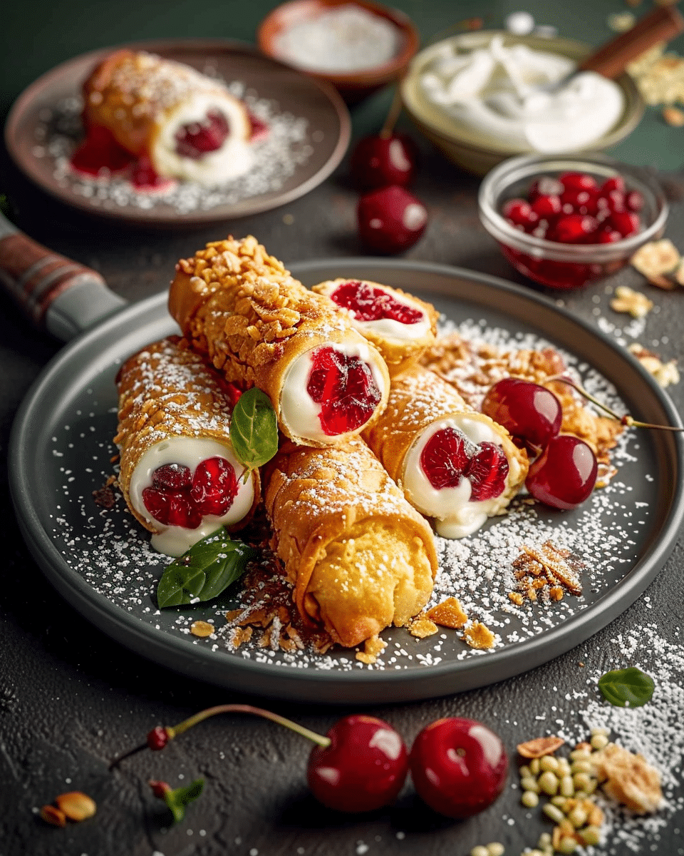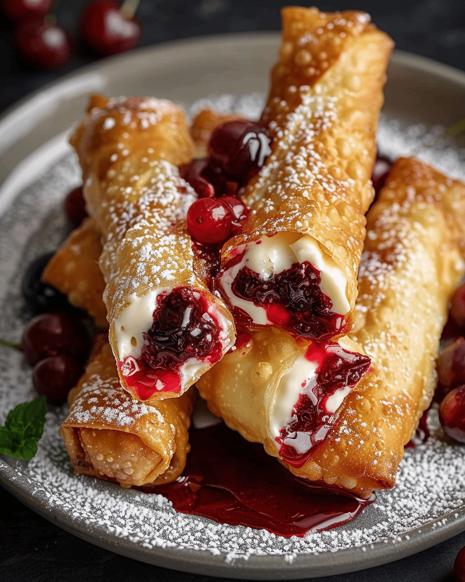 Crispy cherry cheesecake egg rolls are a fun dessert twist with creamy filling and sweet cherry pie goodness. Fried to golden perfection and perfect for any celebration or sweet tooth moment.
