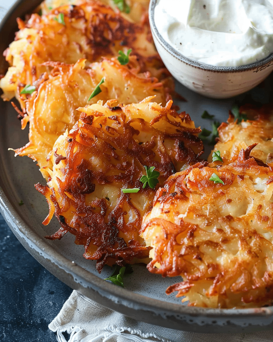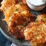 Crispy on the outside with a tender hash brown center, this potato latkes recipe is a must-try comfort food, perfect with sour cream and a sprinkle of salt.
