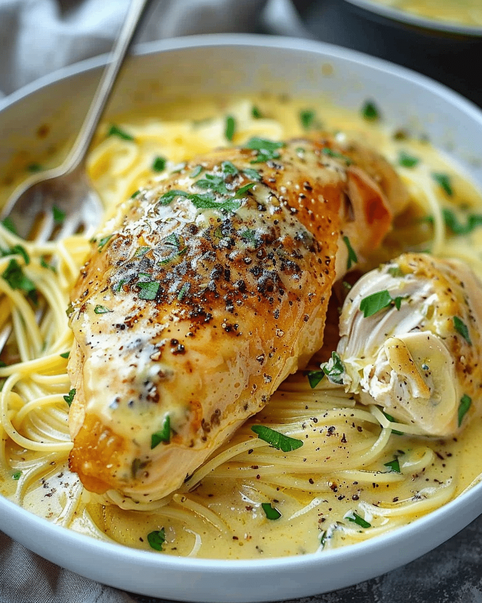 Tender chicken slow-cooked in a creamy garlic-herb sauce, served over angel hair pasta. This comforting classic is perfect for busy nights and guaranteed to satisfy.