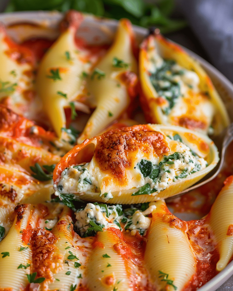 Creamy ricotta, sautéed spinach, and melty mozzarella are stuffed into jumbo pasta shells, topped with marinara, and baked to bubbly perfection.