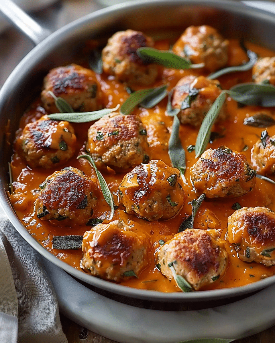 Flavorful turkey meatballs simmered in a creamy, cozy pumpkin sage sauce—perfect for fall dinners or a comforting meal any time.