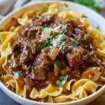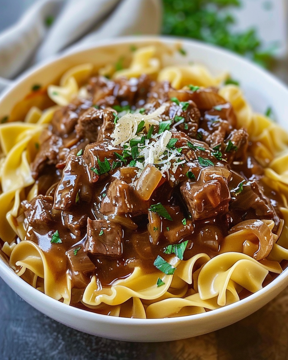 French onion beef and noodles recipe made in one pan with savory ground beef, tender egg noodles, and rich onion broth for a cozy family dinner.
