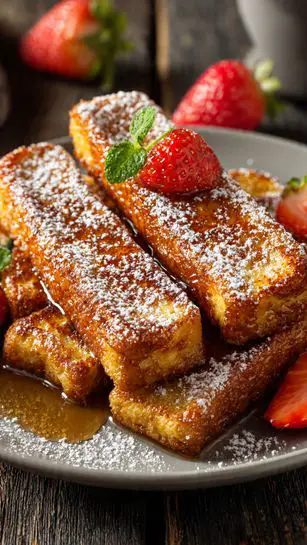 Crispy on the outside, fluffy inside—these French toast sticks are dusted with cinnamon and perfect for dipping in maple syrup. A breakfast favorite made easy.