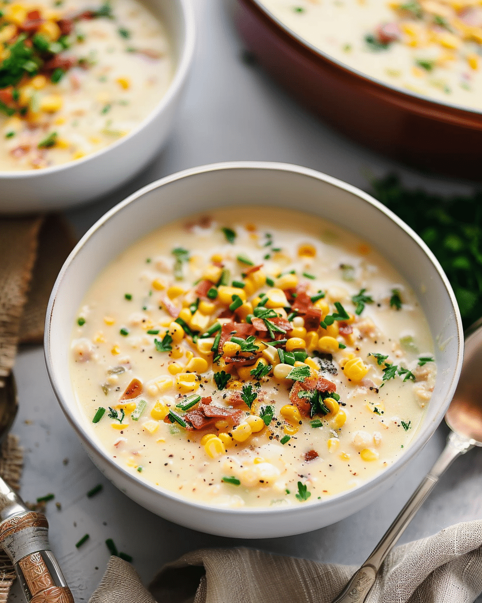 This homemade corn chowder recipe is the perfect cozy bowl—loaded with sweet corn, creamy potatoes, crispy bacon, and aromatic herbs. A comforting one-pot meal ideal for family dinners or chilly nights.