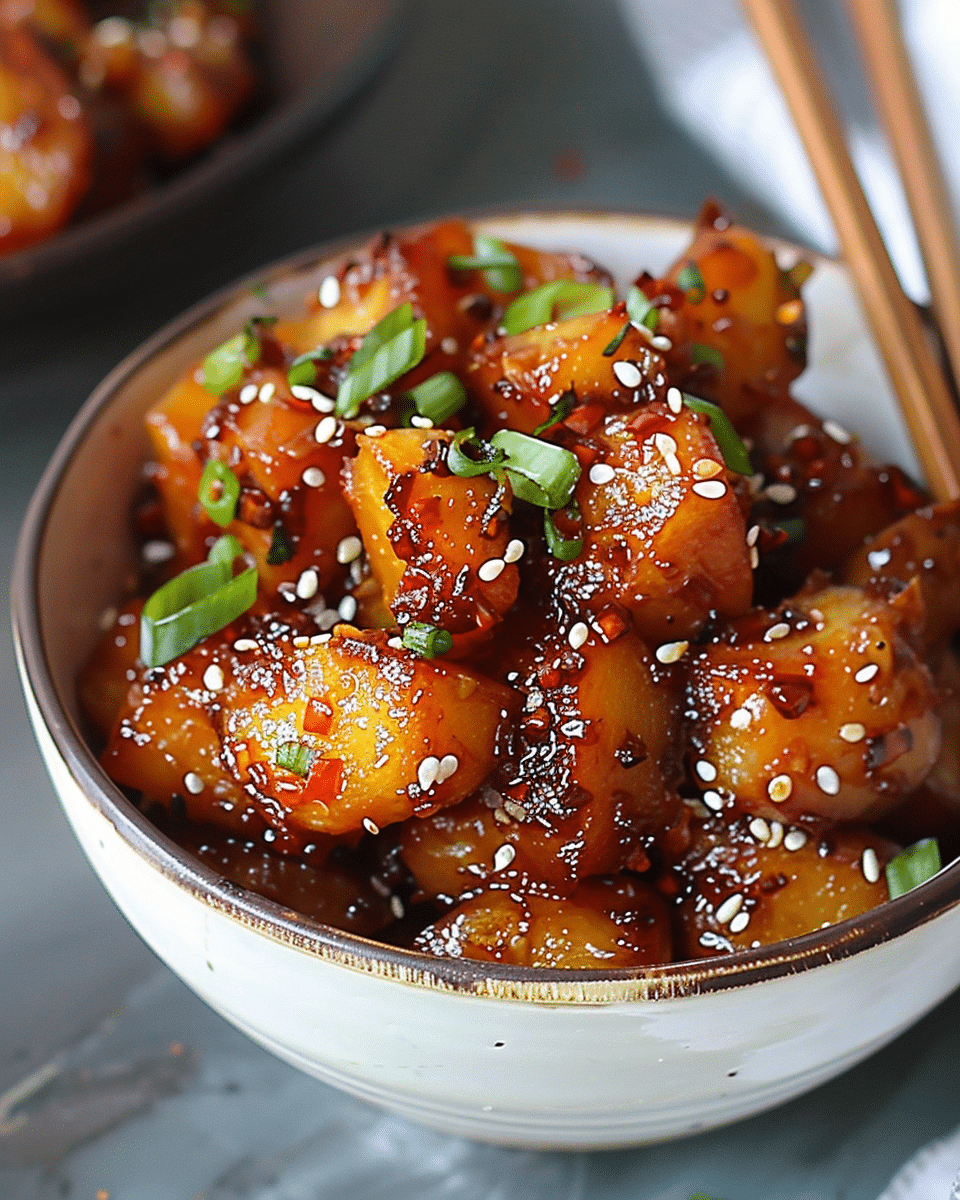 I like this recipe because it transforms everyday ingredients into something that tastes like it came straight out of a restaurant kitchen. Roasted Yukon Gold potatoes have that creamy interior and crisp exterior, and when I toss them in a hot skillet with a glossy chilli-honey glaze, everything caramelizes beautifully. The toasted sesame seeds and fresh chives on top add just the right crunch and freshness. It’s a dish I turn to when I want to impress with minimal effort.