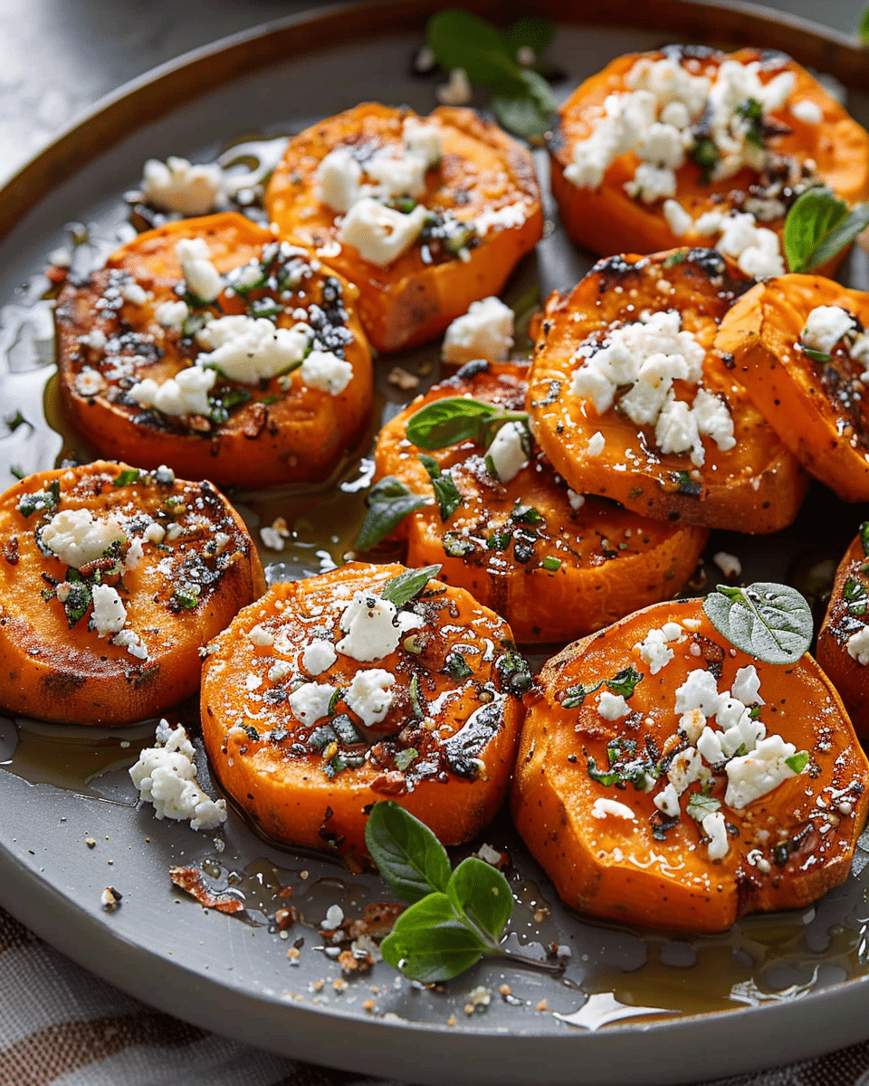 Tender roasted sweet potatoes topped with creamy feta and drizzled with honey—this simple appetizer is packed with flavor and perfect for any occasion.