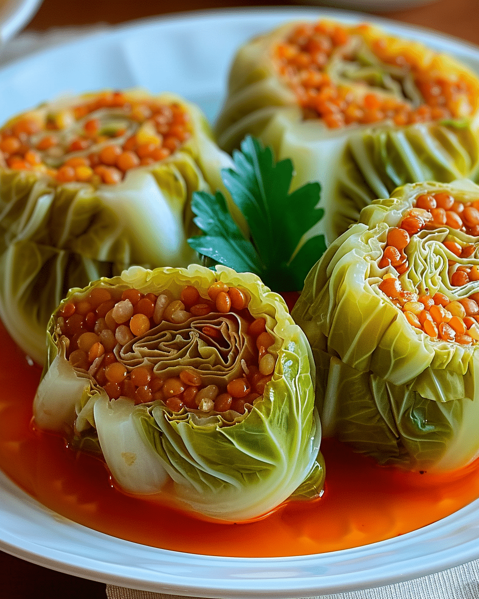 A healthy and hearty plant-based dinner made with tender cabbage leaves filled with seasoned lentils, rice, and herbs, then baked in tomato sauce for cozy flavor.