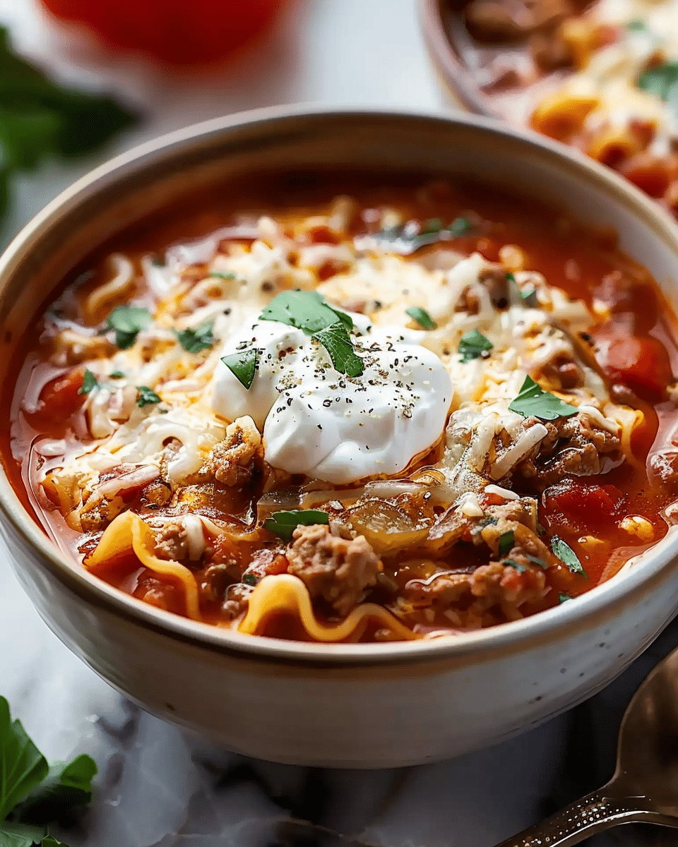 Hearty and comforting Italian Lasagna Soup made with sausage, crushed tomatoes, noodles, and rich Italian spices—perfect for cozy weeknights.