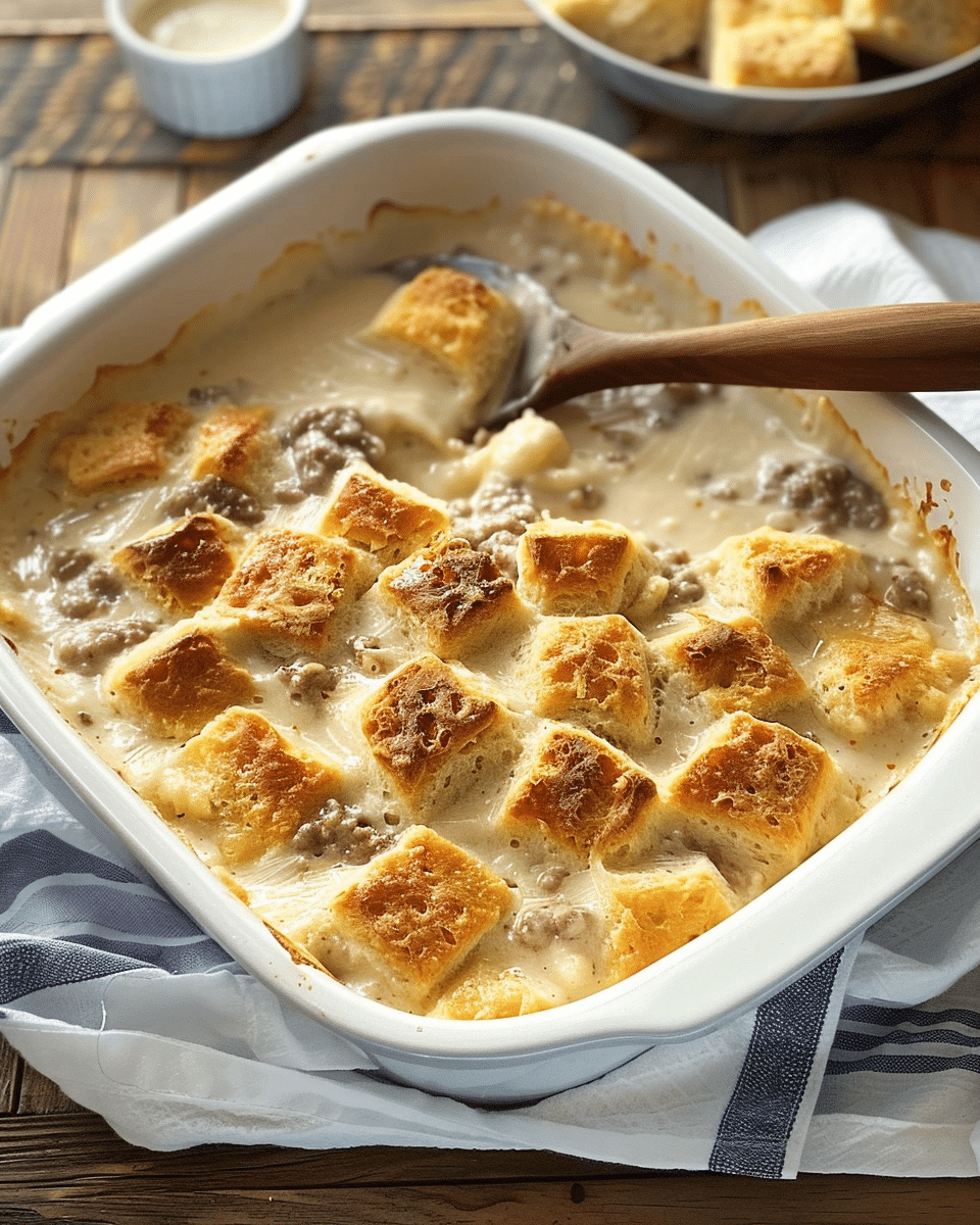 I’ve made this with spicy sausage when I want a little extra kick, and I sometimes season the gravy with black pepper, garlic powder, or cayenne for more flavor. If I’m serving a larger crowd, I double the biscuits and stretch the gravy a bit more—it still turns out great. You can also add shredded cheese on top before baking if you want it extra indulgent.