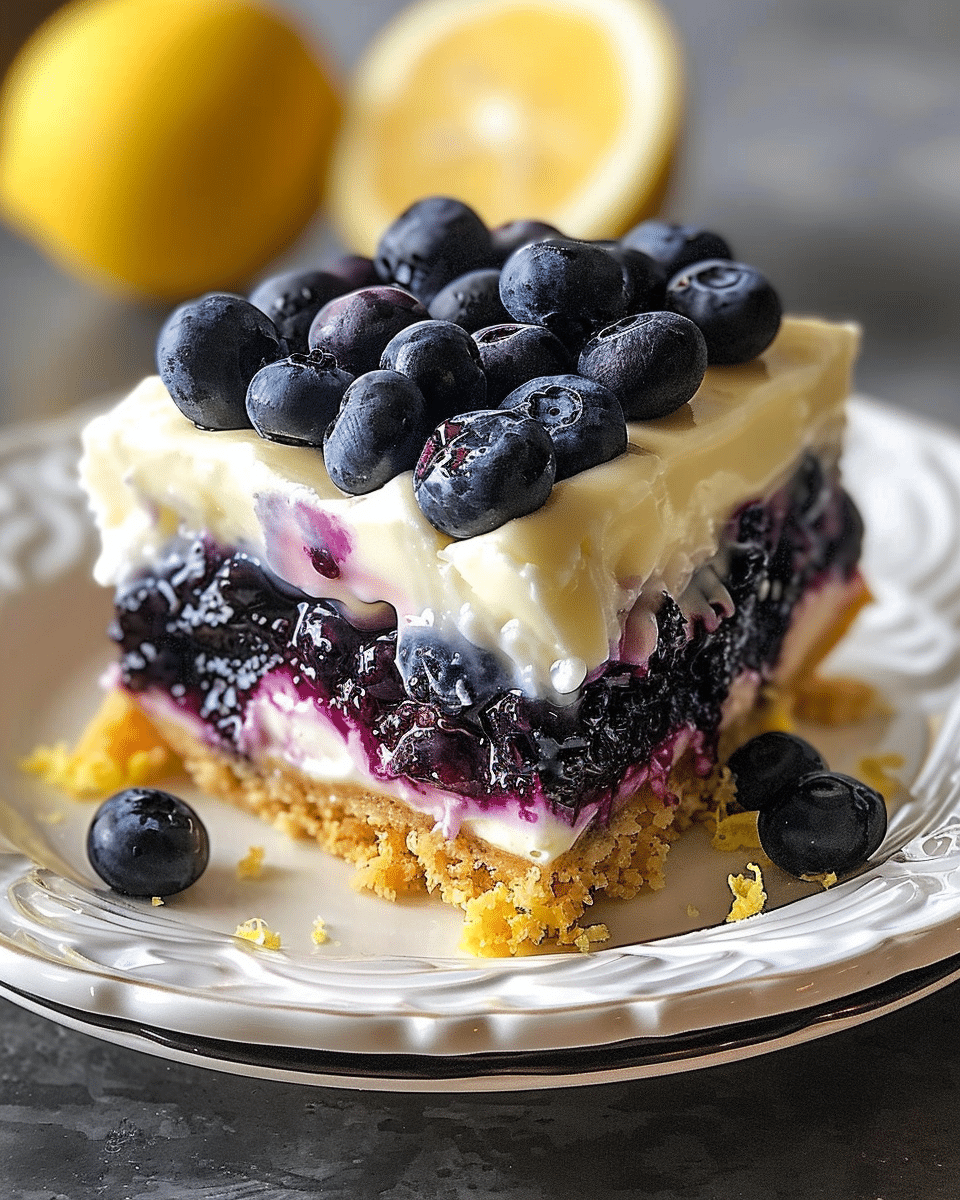I love this dessert because it delivers a full spectrum of flavor and texture—crunchy, smooth, fruity, and creamy—all in one slice. The tang of lemon cuts through the richness, while the blueberries bring a jammy sweetness that keeps it from being too heavy. It’s simple enough to whip up for a weeknight treat but elegant enough to serve at a dinner party or summer picnic. Plus, it can be made ahead of time, making entertaining a breeze.