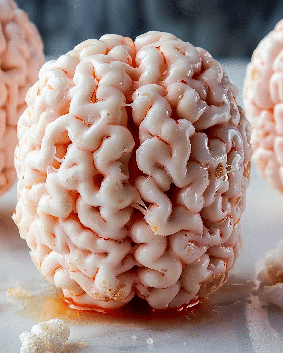 These creepy brain-shaped treats are made with gooey marshmallows, crispy cereal, and red food coloring for a realistic effect—perfect for Halloween parties and spooky snack tables.