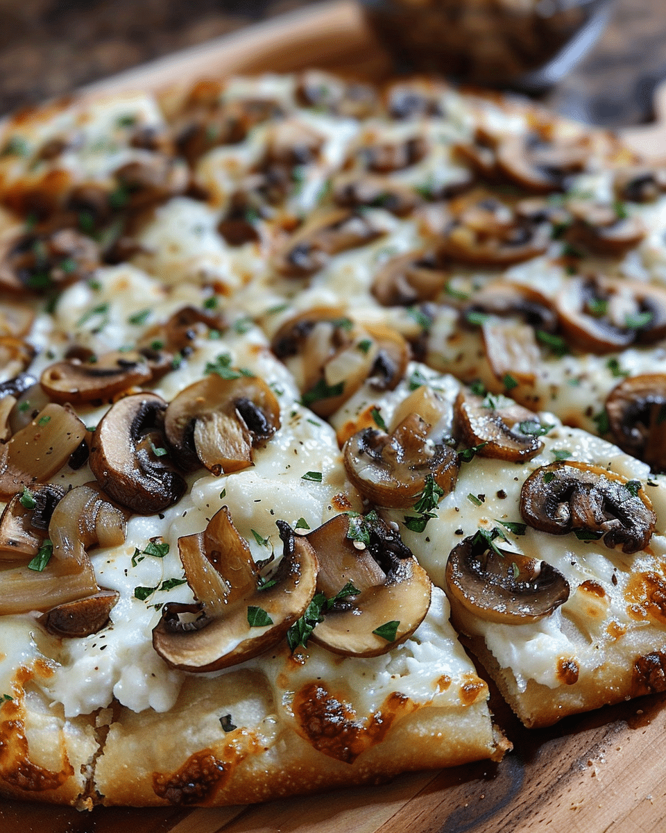 A high-protein, gluten-free white pizza with a cheesy cottage cheese crust, topped with sautéed mushrooms, onions, and melty mozzarella.