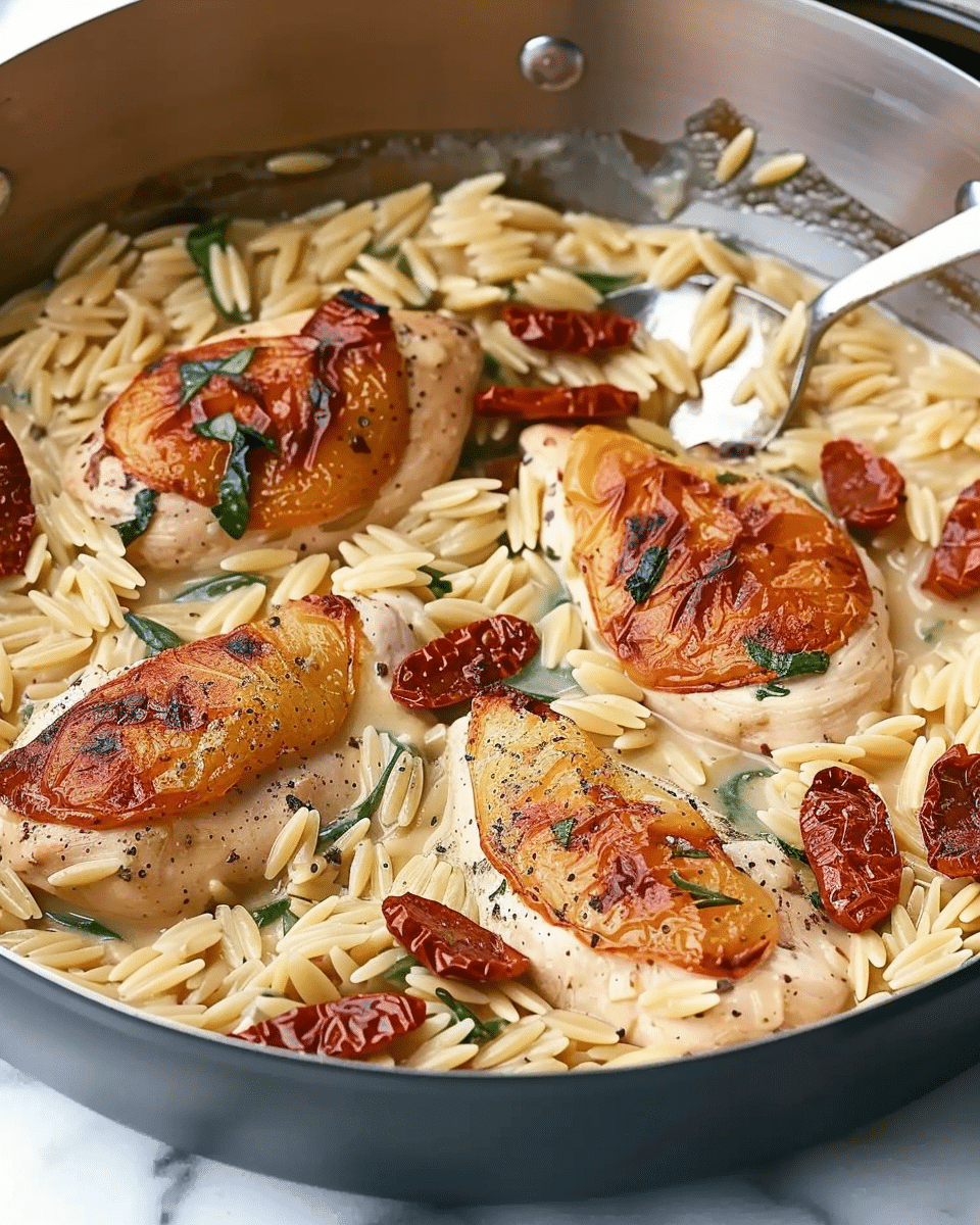 This easy 30-minute dinner is packed with Mediterranean flavors! Juicy chicken, creamy orzo, spinach, and sun dried tomatoes come together in one comforting pot.