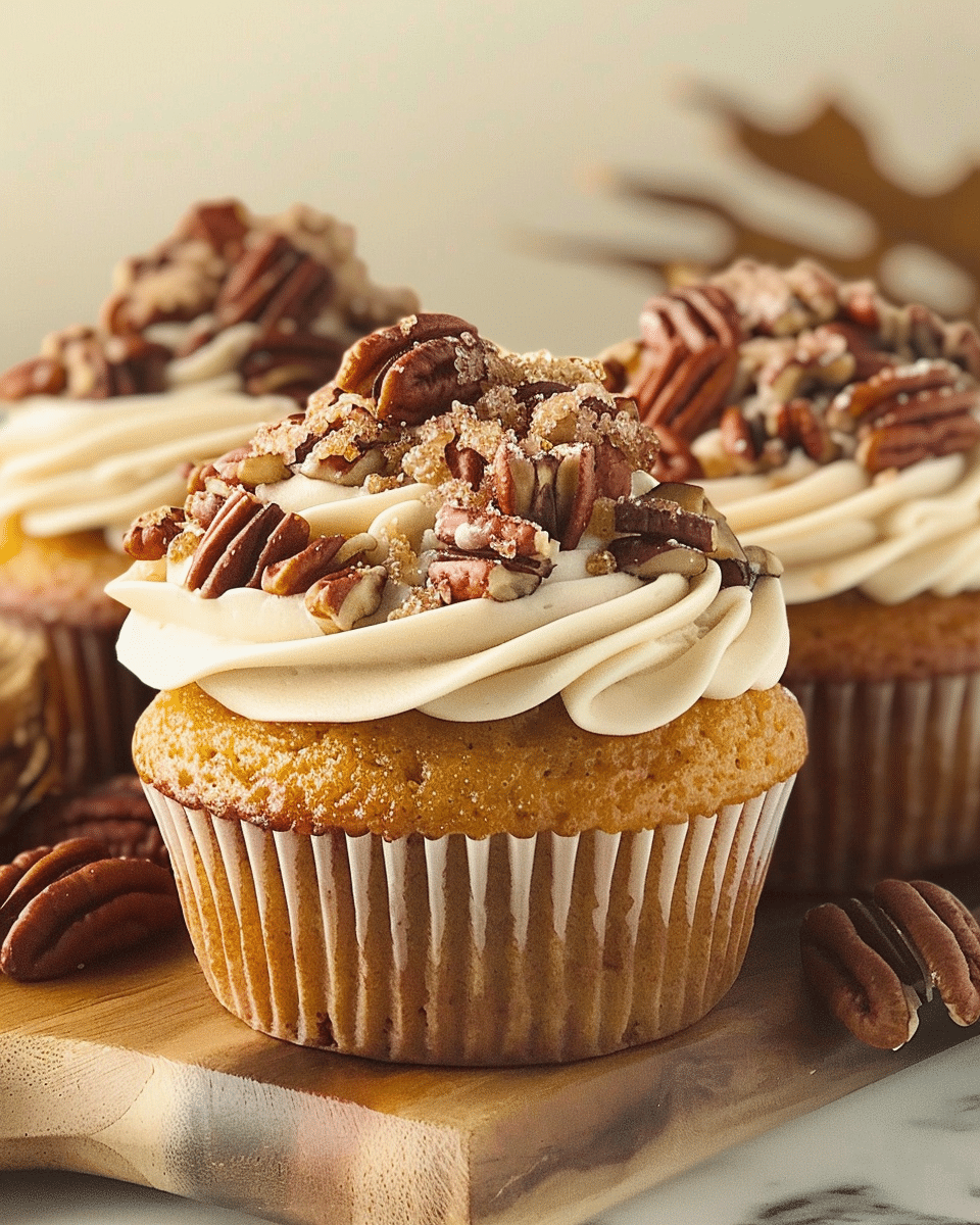 Frost each cupcake with a generous swirl of frosting. Optional: sprinkle chopped pecans on top.