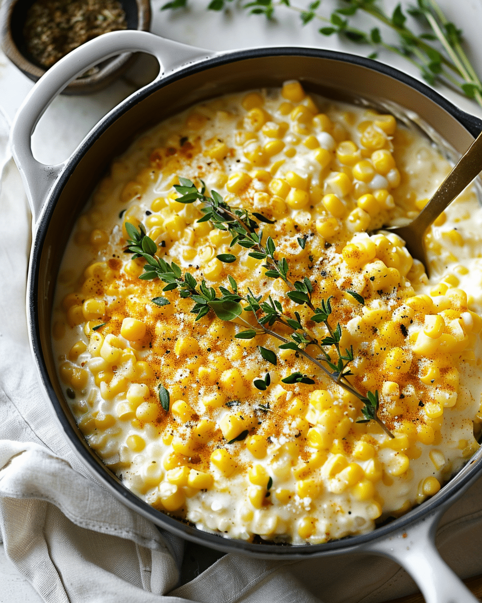 Mix Together: Stir in the corn, heavy cream, and thyme. Cook for 4–5 minutes until the corn is plump.
