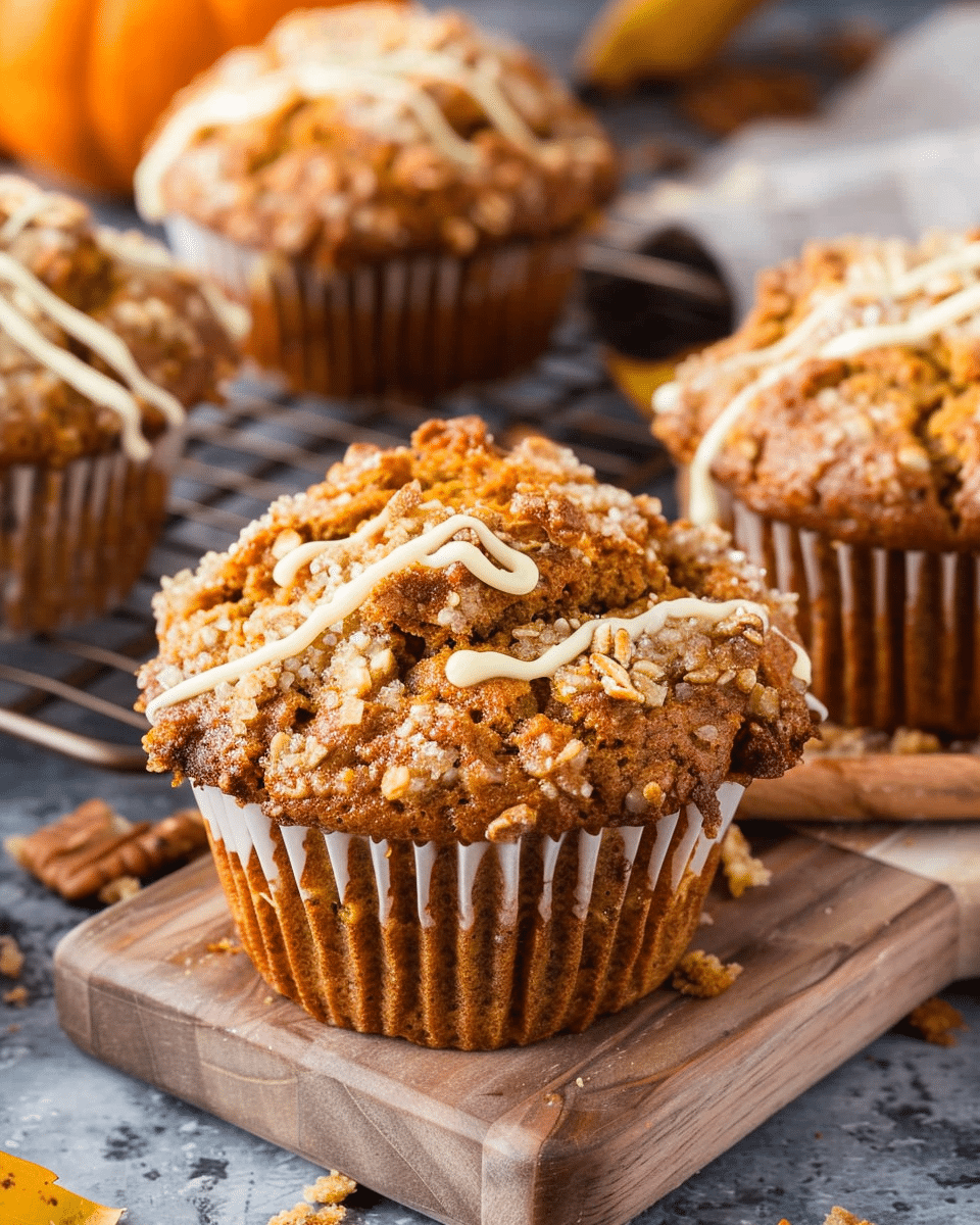 These bakery-style muffins are packed with warm spices, pumpkin, and banana—topped with buttery streusel and optionally glazed for a cozy fall treat.