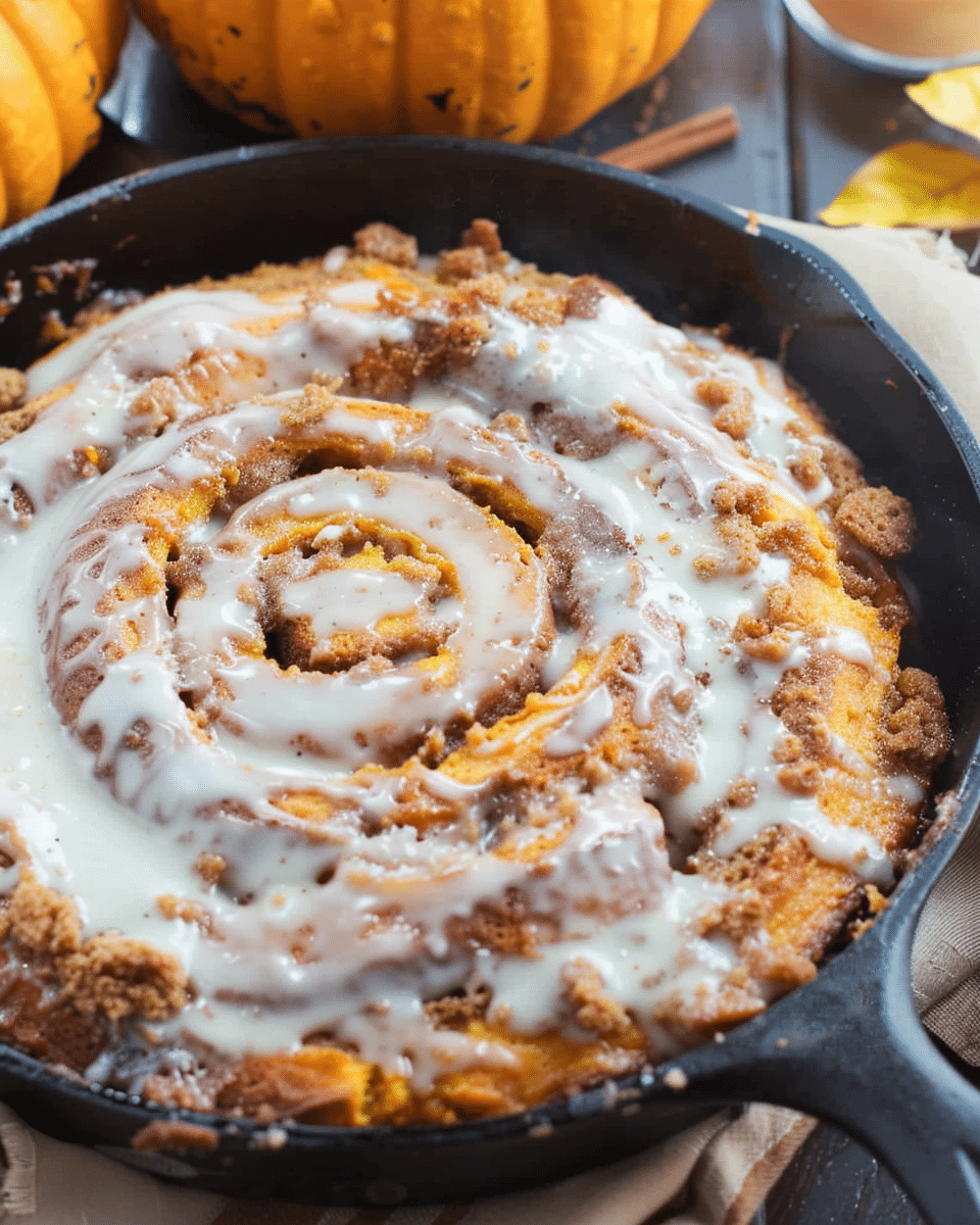 Pumpkin Cinnamon Roll Skillet Cake with Spice Icing