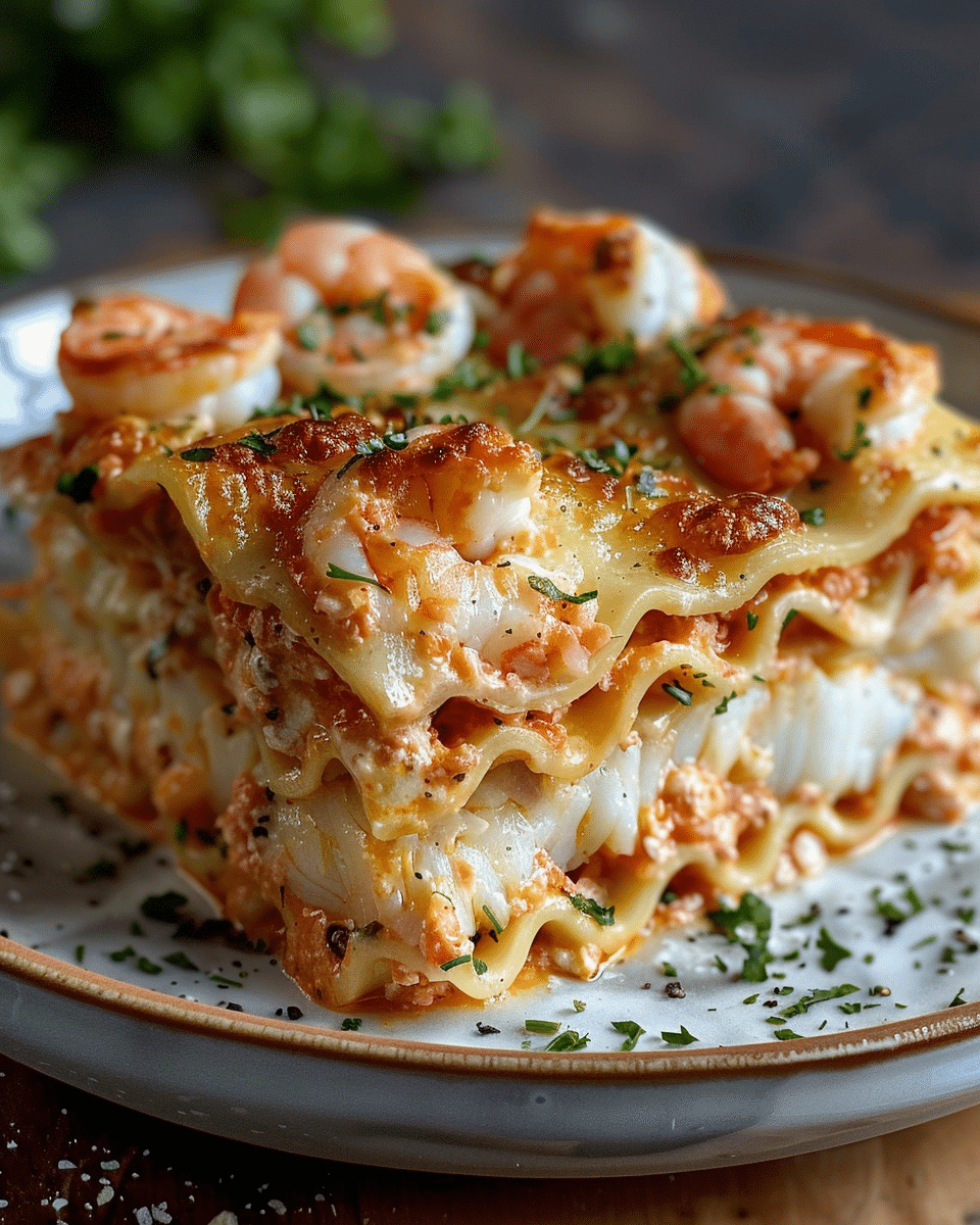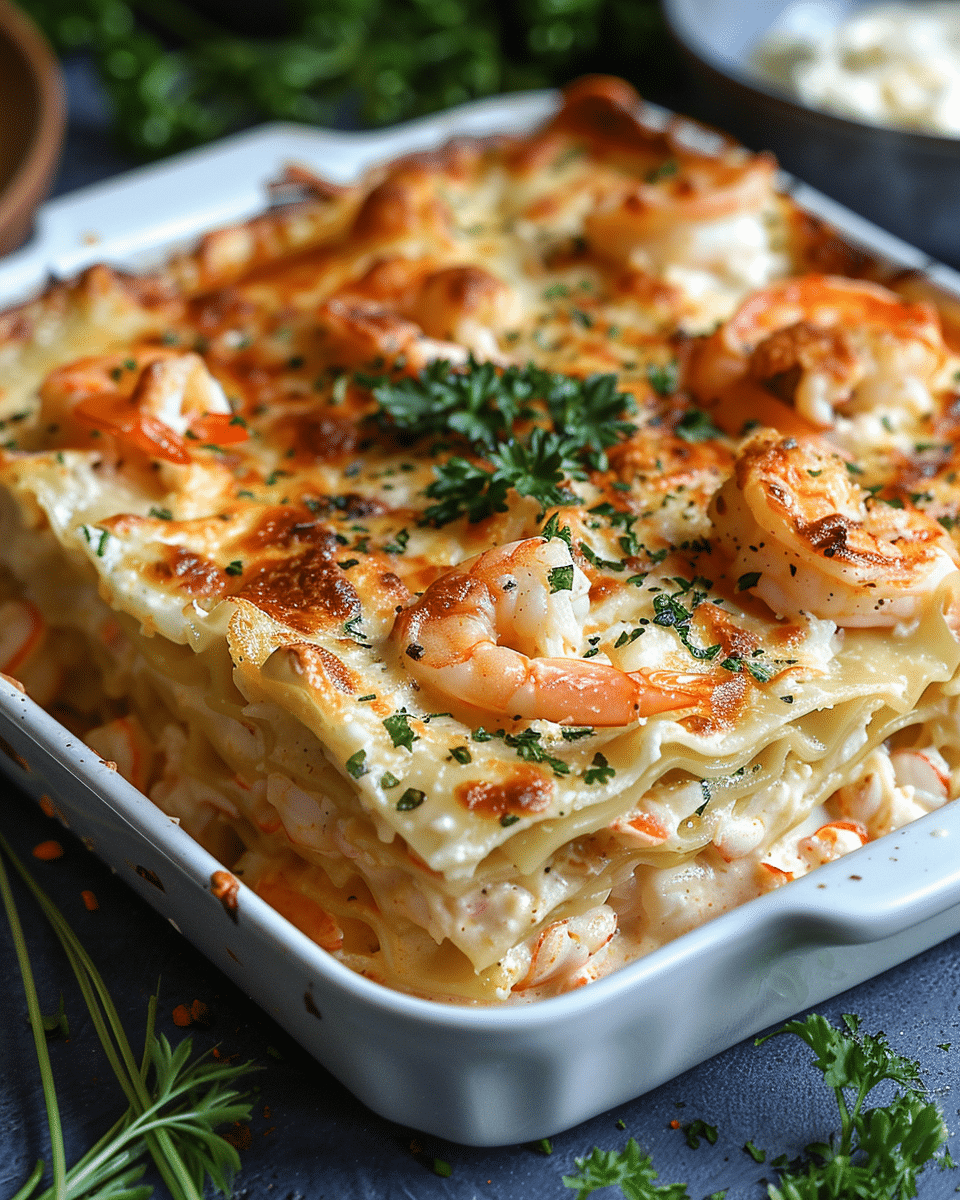 Layers of tender shrimp, sweet crab meat, creamy Alfredo sauce, and melty cheese make this seafood lasagna a rich and unforgettable main dish.