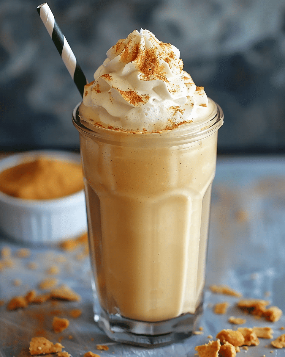 Pour the milkshake into serving glasses. Top with whipped cream, pumpkin pie spice, and graham cracker pieces.