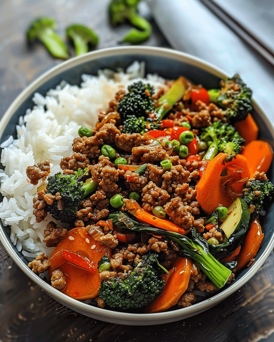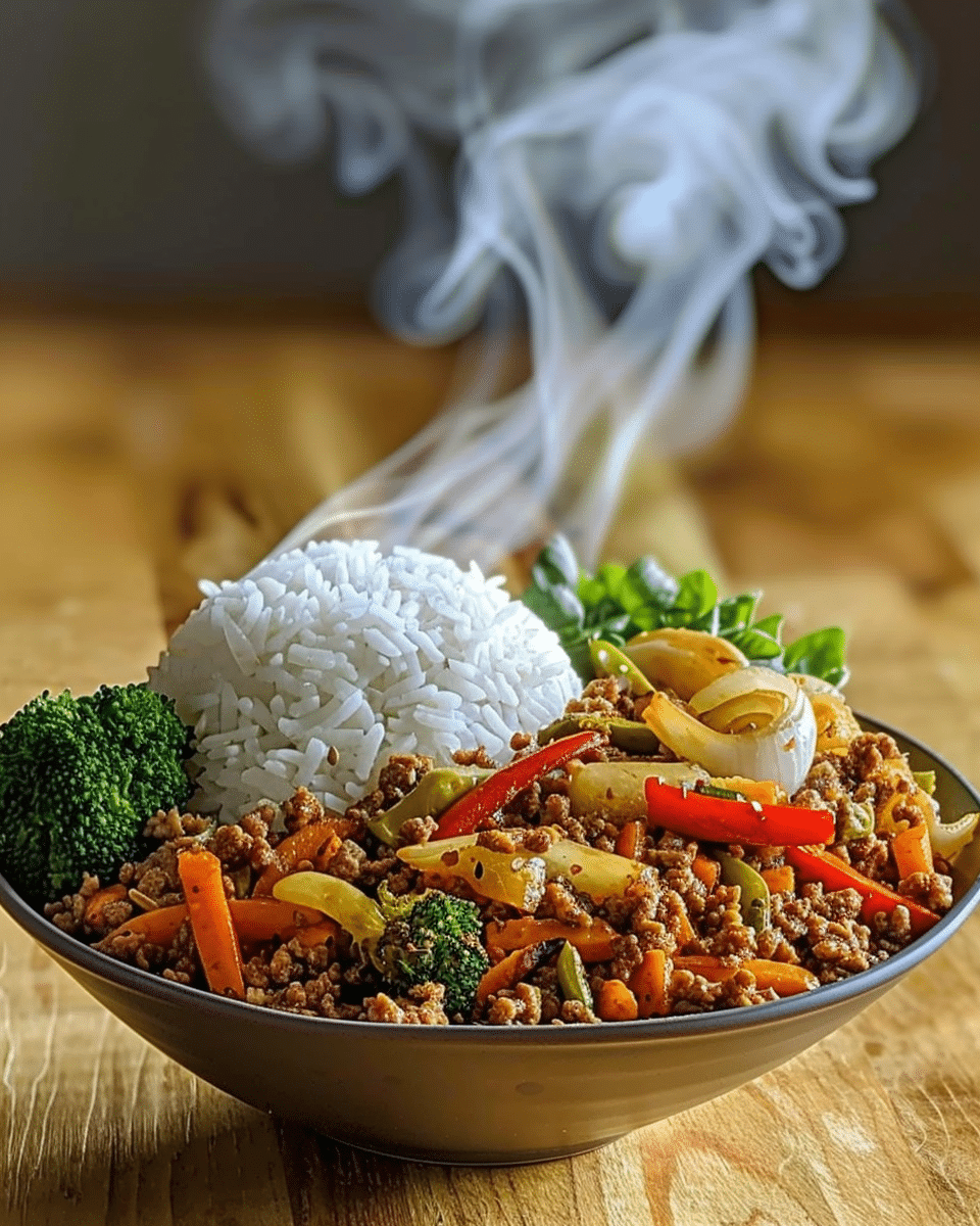 A bold and flavorful weeknight dinner idea featuring spicy glazed ground beef, garlicky stir-fried vegetables, and fluffy steamed rice. Quick, customizable, and better than takeout.