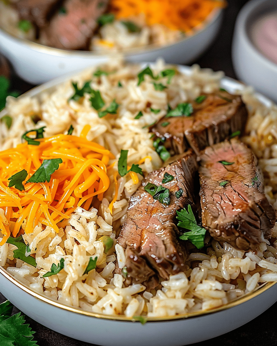 To serve, I divide the rice among plates, top with sliced steak, and spoon warm queso generously over everything. I finish with garnishes for extra color and flavor.