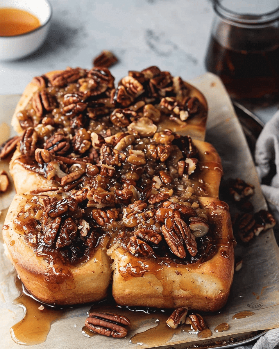 Grease a 9×13 inch baking dish, spread pecan topping evenly in the bottom, and place rolls cut-side up on top. Cover and let rise for 30–60 minutes, or refrigerate overnight (see notes).
