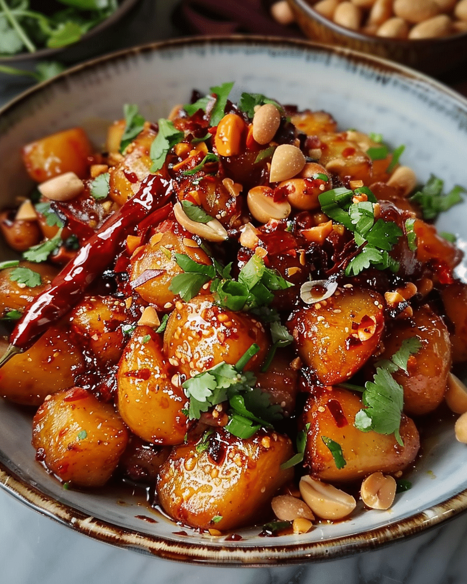 Crispy fried potatoes tossed in a sweet, spicy chili-garlic glaze and topped with crushed peanuts, scallions, and cilantro. This sticky snack is bold, addictive, and totally satisfying!