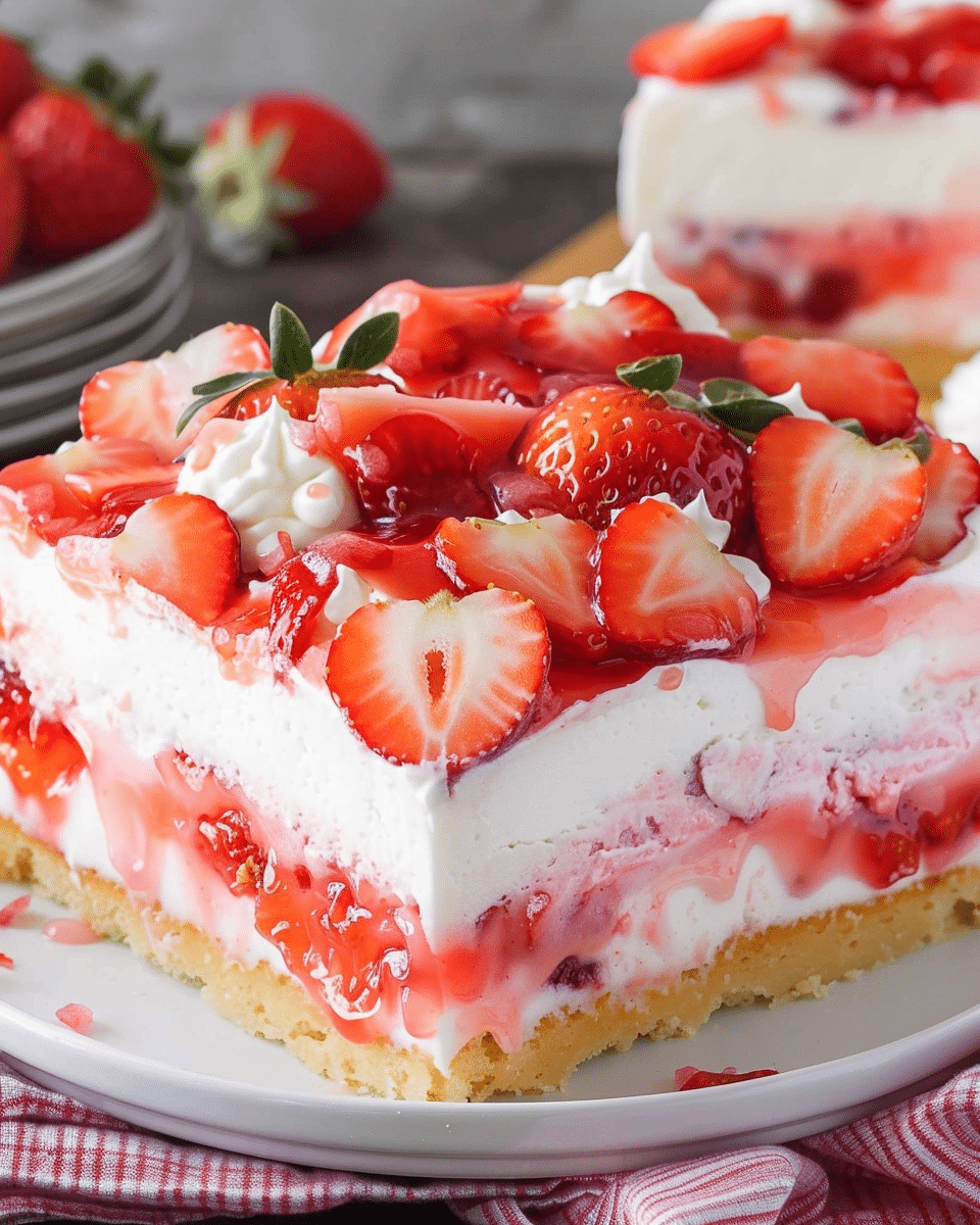 When I want a twist, I swap the strawberry cake for white or vanilla cake mix and swirl in strawberry preserves for extra flavor. I’ve also added a layer of strawberry jam under the whipped topping or used chocolate shavings as an extra garnish. For a little crunch, I’ve sprinkled crushed graham crackers or shortbread cookies on top before serving.