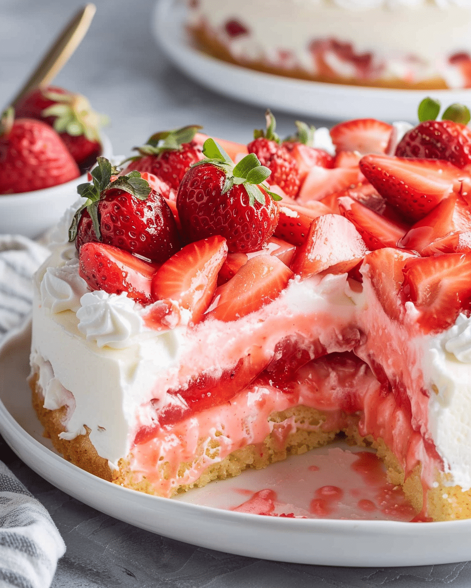 A dreamy strawberry cake soaked with creamy cheesecake pudding and topped with whipped cream and fresh strawberries. Light, luscious, and no-fuss—perfect for any occasion!