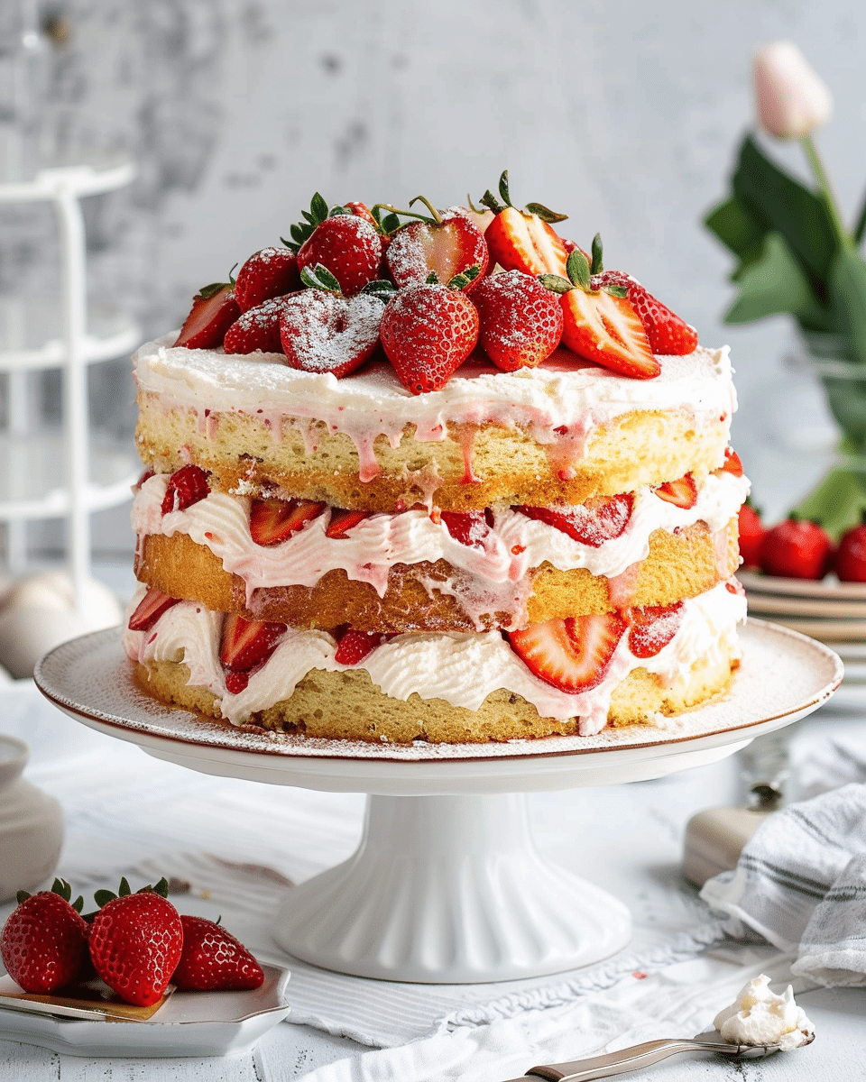 A stunning twist on the classic with layers of light sponge cake, mascarpone whipped cream, and juicy strawberries—perfect for spring and summer celebrations.