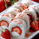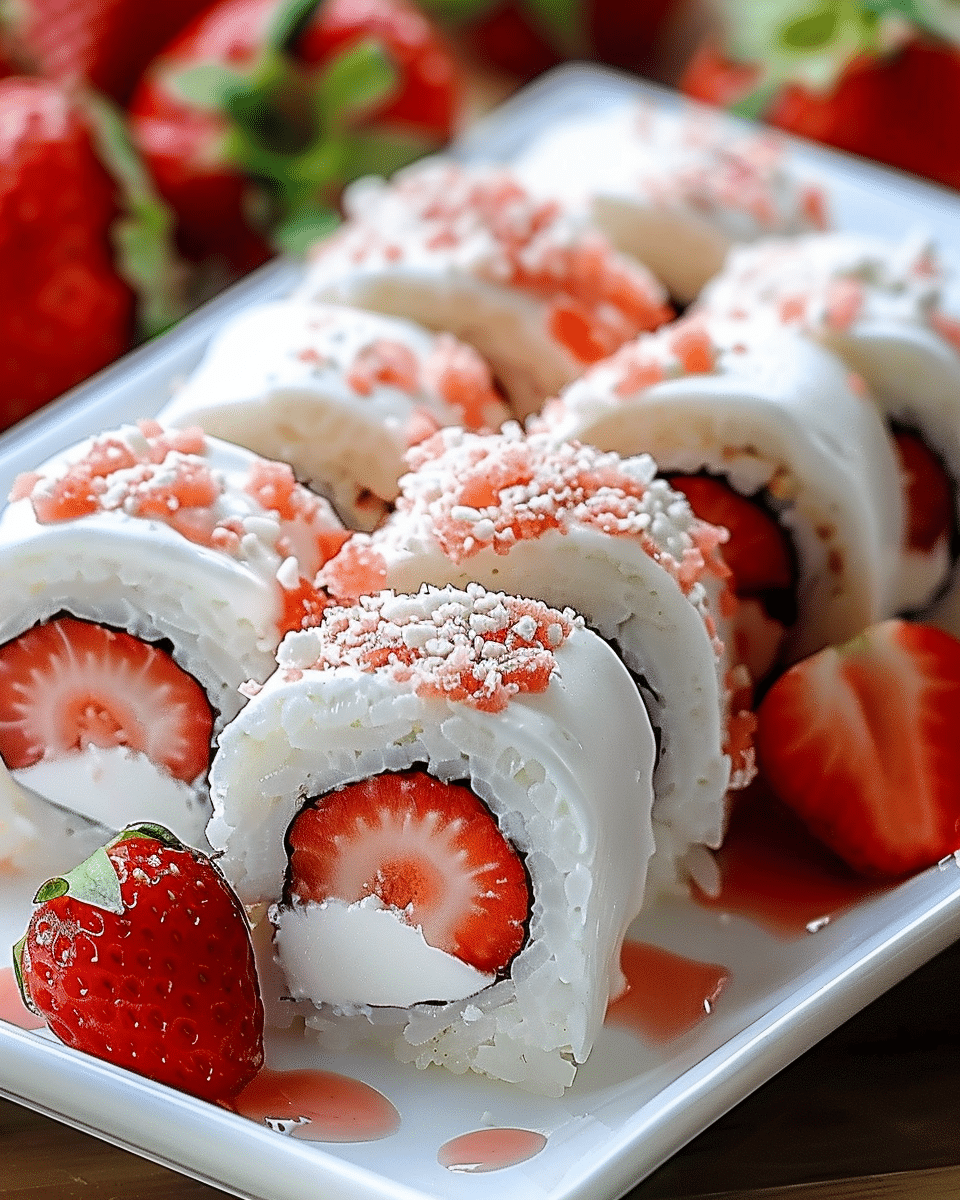 A fun no-bake twist on classic strawberry shortcake! These sweet sushi rolls combine fluffy sponge cake, cheesecake filling, and fresh strawberries into bite-sized treats perfect for parties.