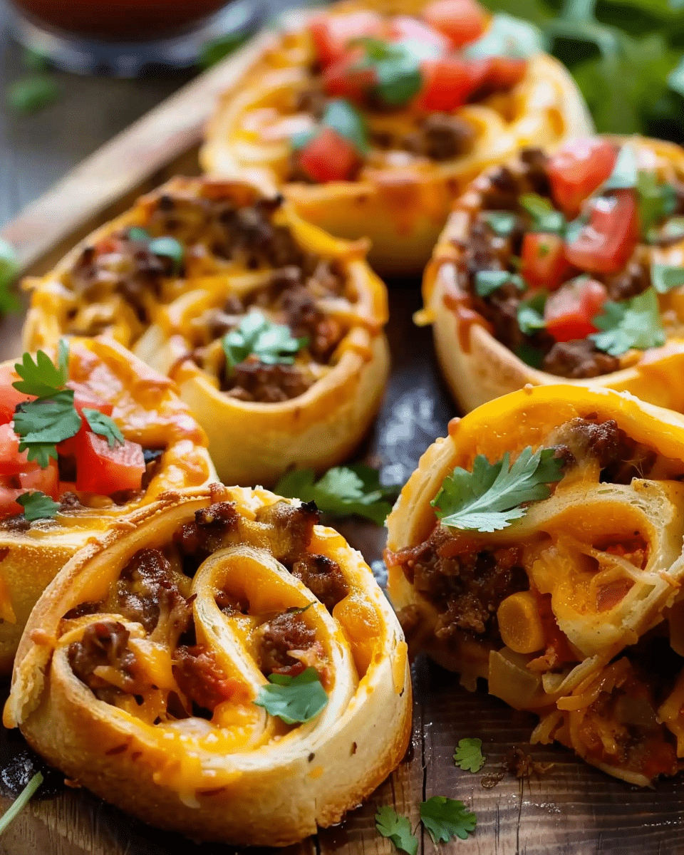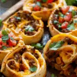These golden, flaky taco pinwheels are filled with seasoned beef, Rotel, and melty cheese—perfect for party snacks, game day bites, or easy dinners.